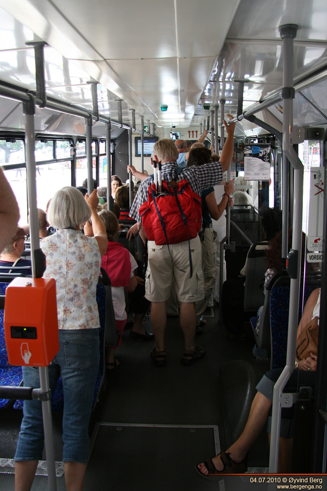 Dette ble min aller første tur i en trolleybuss noen gang. Bussen var fra før av såpass full at det ble ståplasser på de fleste, men det var egentlig helt grei, for den gikk ganske jevnt. Jeg plasserte meg helt bakerst, sånn at jeg kunne ta bilde fremover, og dessuten kikke bak på tilhengeren. Det hadde nok vært interessant å reise i tilhengeren, men med tanke på at vi ikke visste helt hvor vi skulle av så var det greit å holde seg sammen med de andre.