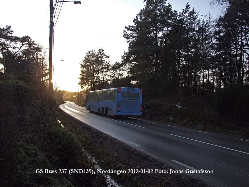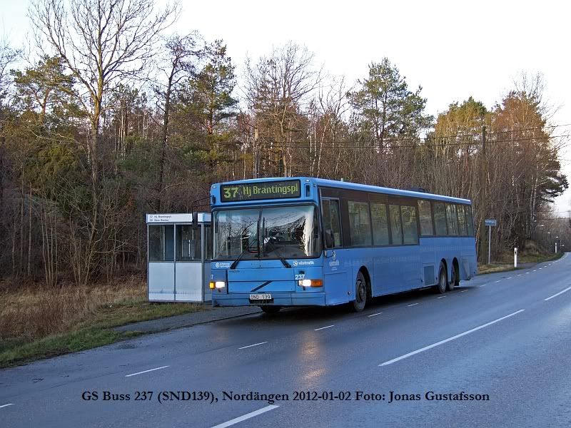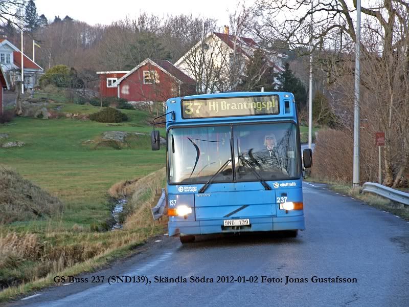 På den långa linje 37 (Klareberg-Eriksdal-(Kungälv)-Kornhalls färja-Säve-Tuve-Hjalmar Brantingsplatsen) kunde man i måndags se två bussar från GS äldsta serie, 237 och 240 från 2001. Här är först fram- och baksida av 237:an vid hpl Nordängen i skogen mellan Eriksdal och Kornhalls färja.