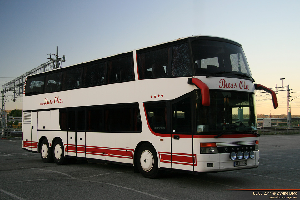 Første helgen i juni var som årets norske veteranbusstreff i Drammen, men jeg velger å ta med et bilde av en helt annen buss som tilfeldigvis var i byen samtidig. Så det svenske bidraget i denne årskavalkaden blir en Setra S328DT med dobbel midtdør fra Buss-Ola i Hjo.