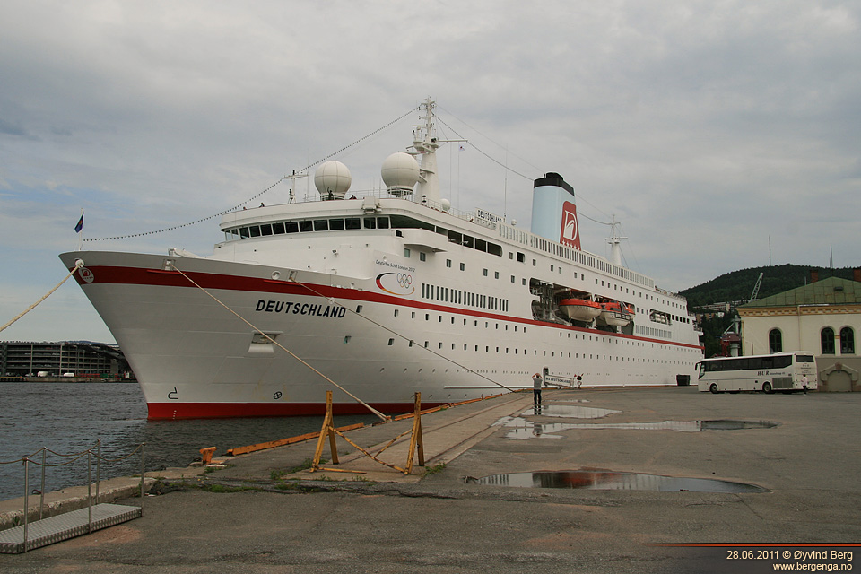 En uke senere så jeg et syn jeg ikke helt hadde forventet å se i Drammen. Ved Tollbukaia der det i begynnelsen av måneden stod fullt av veteranbusser, lå det nå et cruiseskip. Anledningen var at det rett og slett ikke var plass til flere skip i Oslo, så da ble dette skipet sendt til Drammen, mens det gikk busser i skytteltrafikk til og fra Oslo med passasjerene. Visstnok er dette eneste gangen på flere år at det har vært et cruiseskip i Drammen.