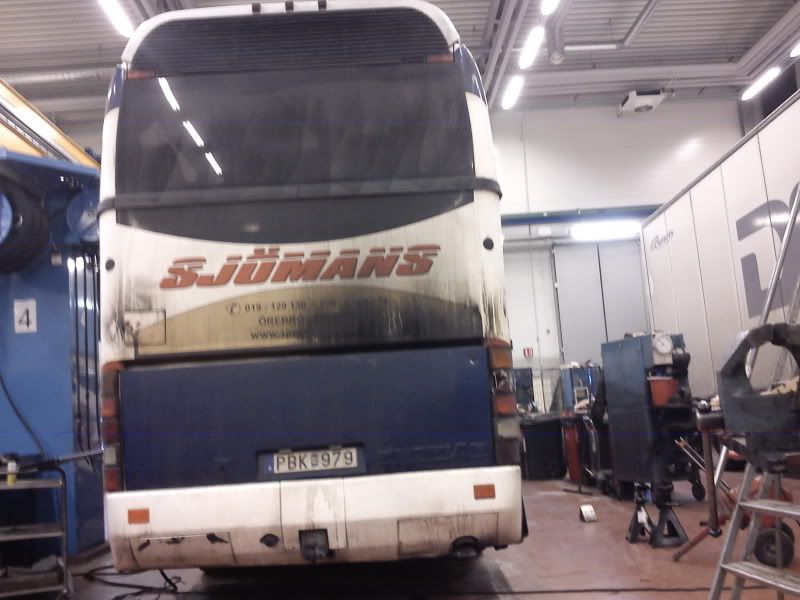 Sjömans Buss Neoplan N113/3 årsmodell 2000, PBK 979 står just nu på Arver lastbilar i Örebro efter motorbrand, motorrummet är totalskadat och golvet längst bak sviktar, röklukt känns i hela bussen. Bussen avställd 2012-02-09 så det har säker precis hänt.