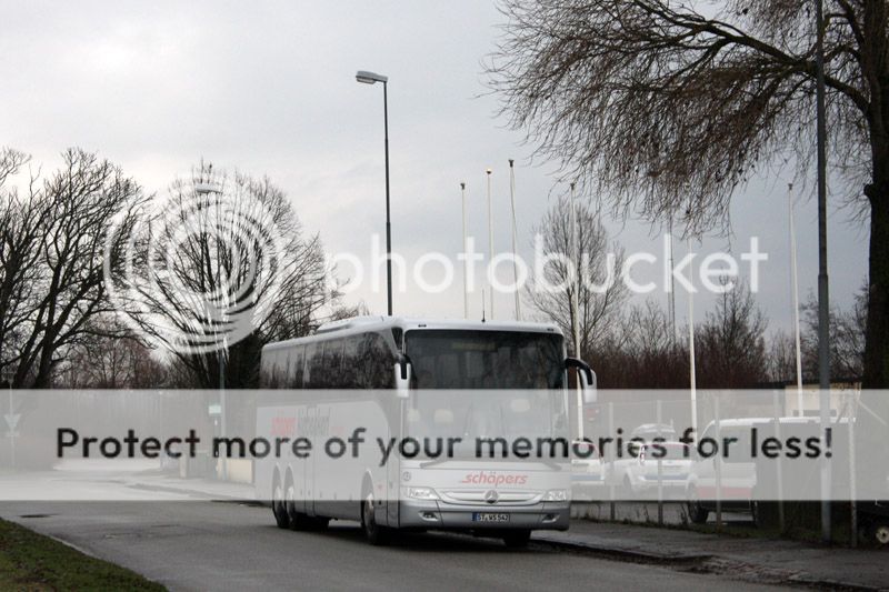 En tysk Neoplan och två andra bussar som stod mindre fotovänligt vid 8-tiden