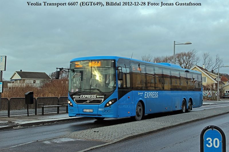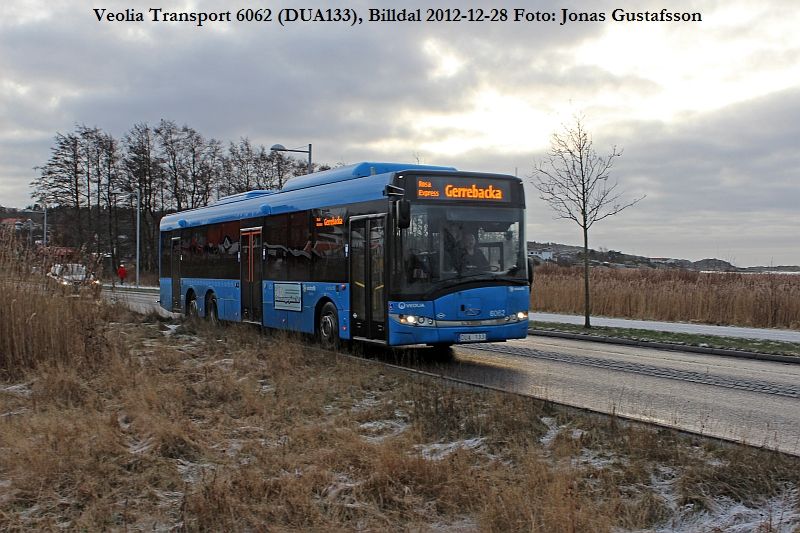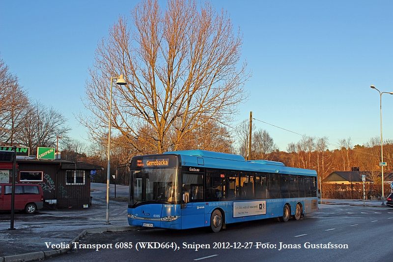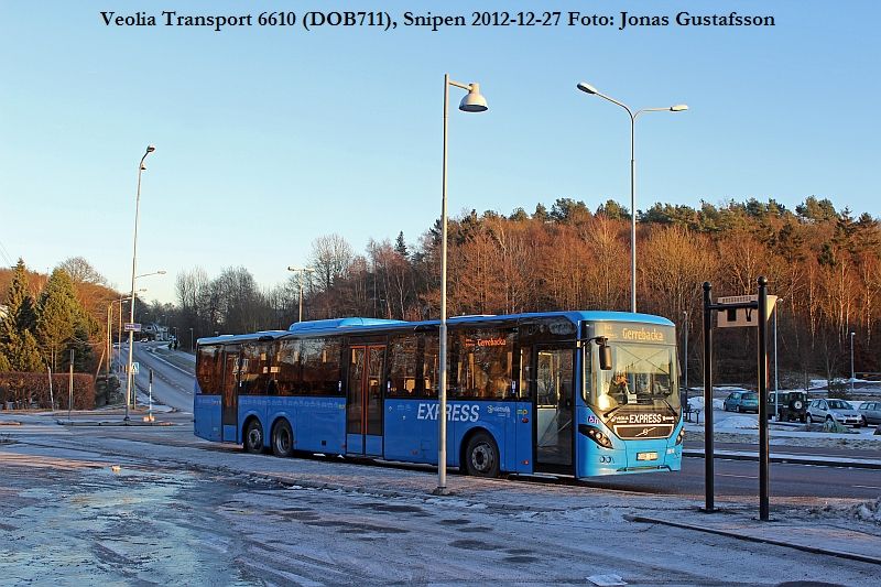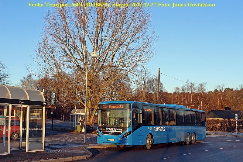 Rosa Express körs som jag tidigare visat av Veolia Transport, dels med Solarisbussar som redan förut (med linjenummer 80) trafikerade södra delen av linjen, dels med nya Volvo boggibussar (6600-6616) med expresstandard. Här är några fler bilder, från Snipen 27/12 och Billdal 28/12. Ber om ursäkt för att Billdalsbilderna är något oskarpa - dunkelt ljus och bussar i rörelse...