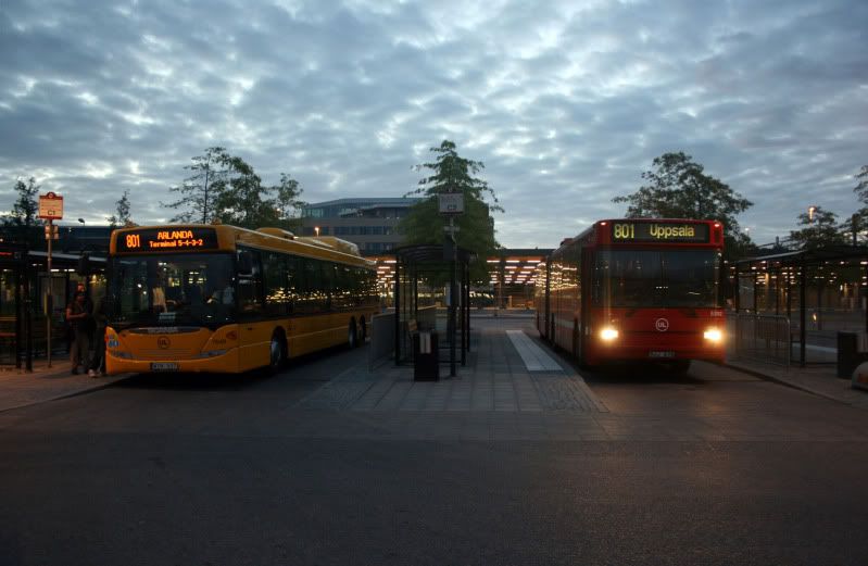I Juni var det dags för den stora trafikstarten i Uppland, då Nobina tog över majoriteten av UL-trafiken med 130 nya regionbussar. Här är allra första turen på 801 (kl 03:03) med 7649 och näst sista turen från gamla avtalet med 5392 som nyss ankommit till Uppsala..