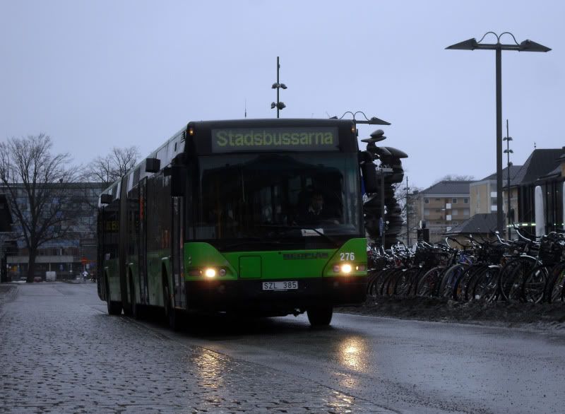 När samtliga nya MAN var i trafik var det tråkigt nog dags för GUBs 7st Neoplanleder 270-276 att lämna Uppsala för alltid. Här är 276 på sin allra sista färd över Uppsala Centralstation: