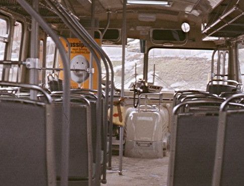 En bild i repris som visar hur det kunde se ut inne i en omställningsbuss med räcken. Detta är en högertrafiksbuss som gick i vänstertrafik med provisoriska vänsterdörrar. Räckena ledde fram resenären till föraren för biljettering. Bilden är från en av vagnarna 125 - 129 i Borås, troligen alldeles när de satts i trafik år 1965.