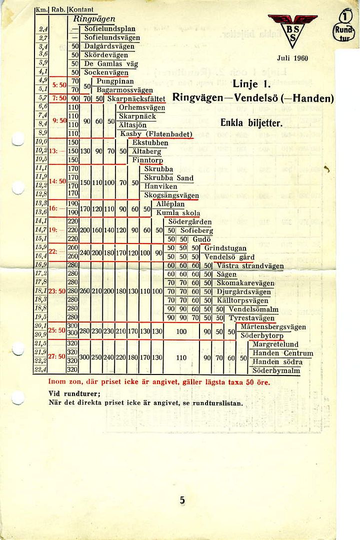 Priser på Busstrafiken Stockholm - Södertörns (BSS) bussar 1960, linje 1 Stockholm (Ringvägen) - Vendelsö. Km-tal längst till vänster.