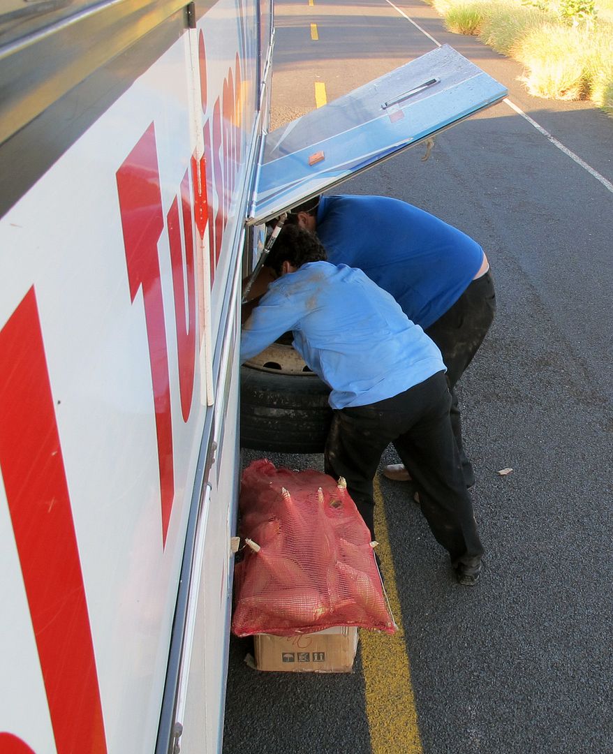 Enligt vad vi hört var tullarna vid gränsen ute efter smuggelgods. Därför reageade jag inte under ett långt stillestånd på skrammel från spett och dylikt utan sov vidare. Men vaknade till och såg hur de två förarna stuvade in ett reservhjul. Sedan erfor jag att en bromstrumma brustit och vi körde vidare med broms på tre hjul.