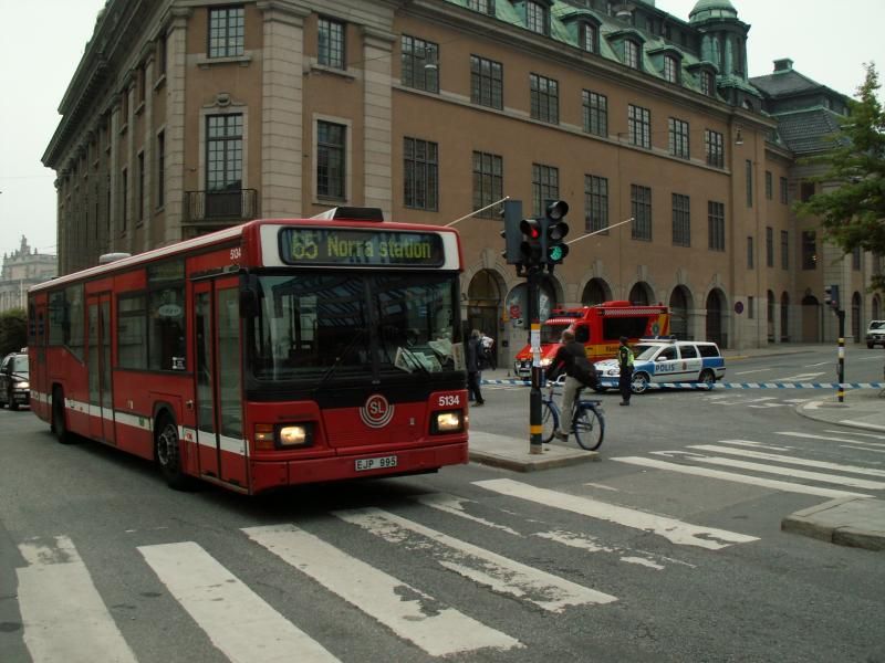 Nu tar vi klivet över till bussdepån på andra sidan stan och Hornsbergs 5134 som passerar samma polisavspärrning som 5112.