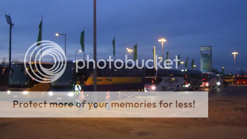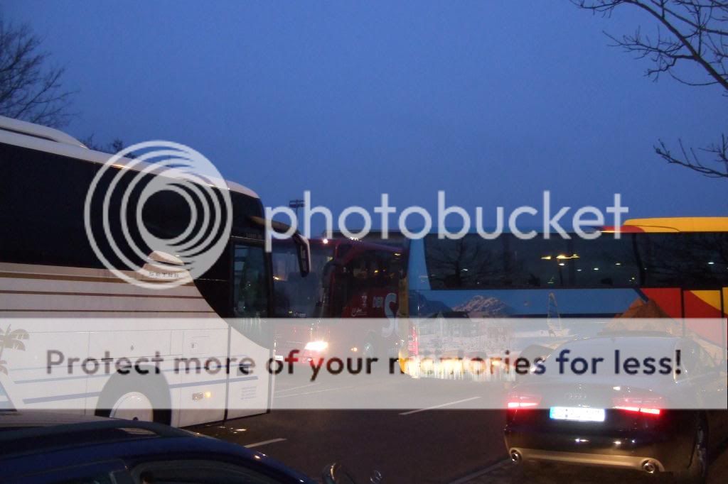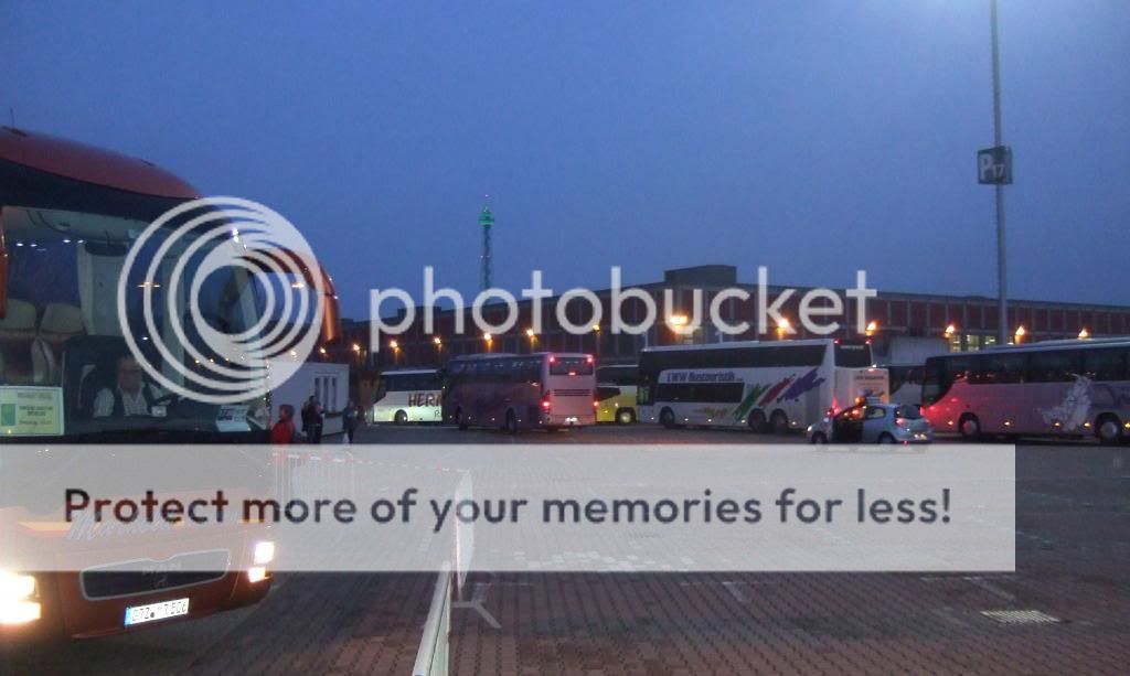 ...och chaotiska situationen. Der finns en trafikljus med endast 6 sekunder grönt... . Till höger en Travego fra POLSTER+POHL, i mitten en buss fra DER SCHMIDT, dom var med nio stycken bussar kommit fra Wolfenbüttel... .