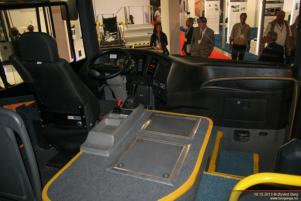 Dette er en frontmotorbuss med en Cummins ISB motor. Motorkassa tar opp nesten all plassen foran i bussen. Det går greit an å gå forbi den og bakover, men for de som har vanskelig med å sette ned beina kan det være litt problematisk. Sjåføren kommer seg til stolen sin ved å gå foran motorkassa, men jeg mener å huske at det var ganske trangt der. Siden motorkassa ikke har noe høye kanter eller noe mulighet til å stroppe fast noe, kan man jo heller ikke bruke den plassen til bagasje. Det ser det derimot ut som man kan med tomrommet bak førerstolen. Jeg tok dessverre ingen bilder bakover i bussen, men den var utrustet med 34 passasjerstoler.