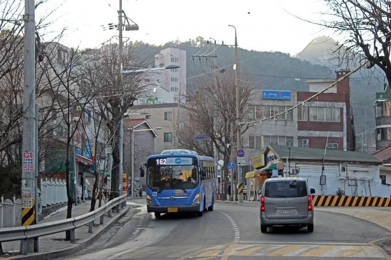 Bilden är tagen 15 februari i år i nordöstra Seoul nära entrén till Bukhansans nationalpark (Bukhansan är ett över 800 m högt berg som ligger inom Seouls stadsgräns). Bussen är en Hyundai tillhörig ett företag som i engelsk form har namnet Daejin Passenger Co., en av de många entreprenörerna i tiomiljonstadens busstrafik.