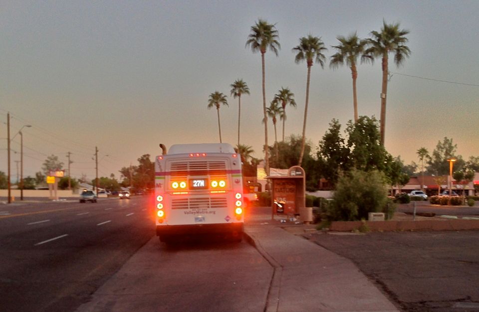 Phoenix, Arizona, (där jag bor) har ett ganska omfattande nät av busslinjer. Vad som är typiskt för dessa linjer är att det finns väldigt få hållplatsfickor, bussarna stannar alltså ute i körfilen. Detta medför relativt många tillbud med bilar som inte hinner stanna eller väja. Bussarna har därför varningsljus baktill och på de senaste bussarna, New Flyer C40LFR, har man gjort dessa varningsljus ännu effektivare.