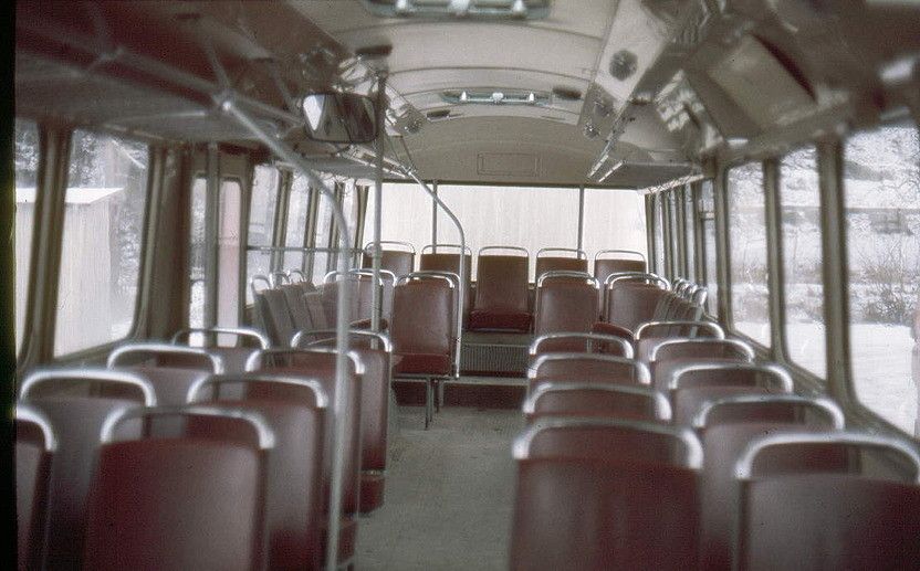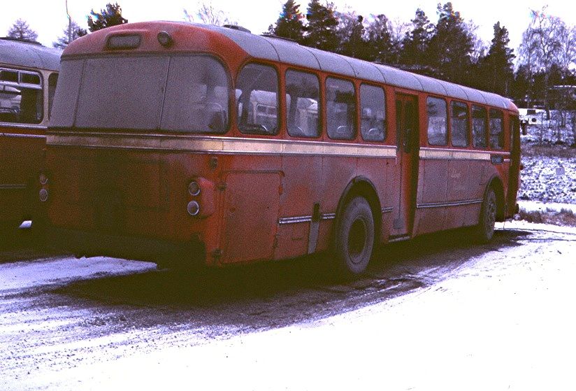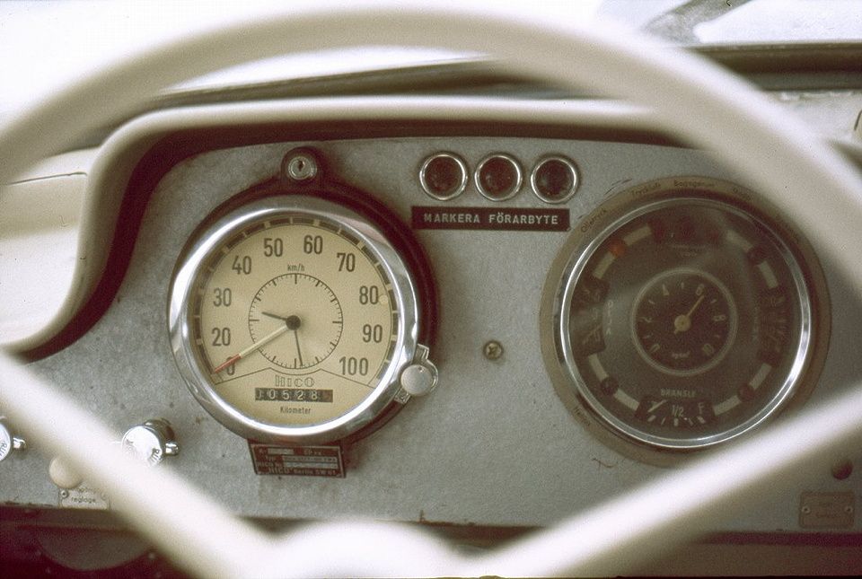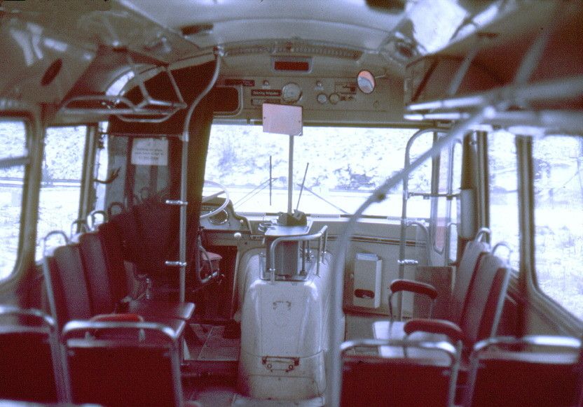 Jag passar väl på och ger några fler detaljer om vagn (77)15. Den var, som sagt, 1960 års modell. Hade en fyrväxlad låda vilket gjorde den ganska surrig inuti när man kom upp i 70 km/h. Den var utrustad med dubbla bränsletankar, en på varje sida bakom bakaxeln. De var förbundna med varandra så bränslepåfyllning kunde ske från valfri sida. Vagnen var även försedd med en klocka för de resande placerad i mitten ovanför vindrutorna.