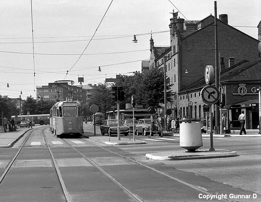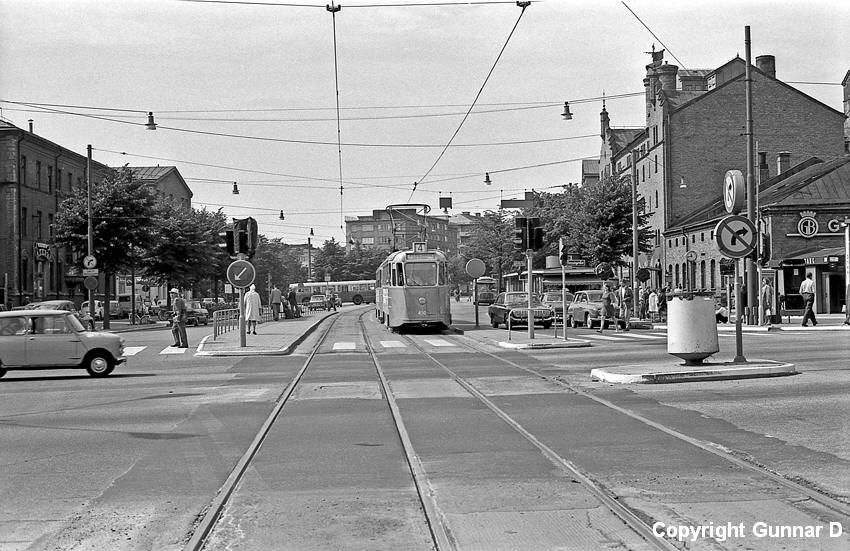 Wow, den bilden väcker många minnen till liv. Bland annat tre olika jobb jag haft, busskonduktör vid BSS (BSS 170-vagn), spårvagnskonduktör vid SS (A25 Mustang) och bussförare vid SJ (CF)! Och strax utanför bildens vänstra kant Konditori Åkern där jag spenderat en förmögenhet på kaffe och sådana förnödenheter.