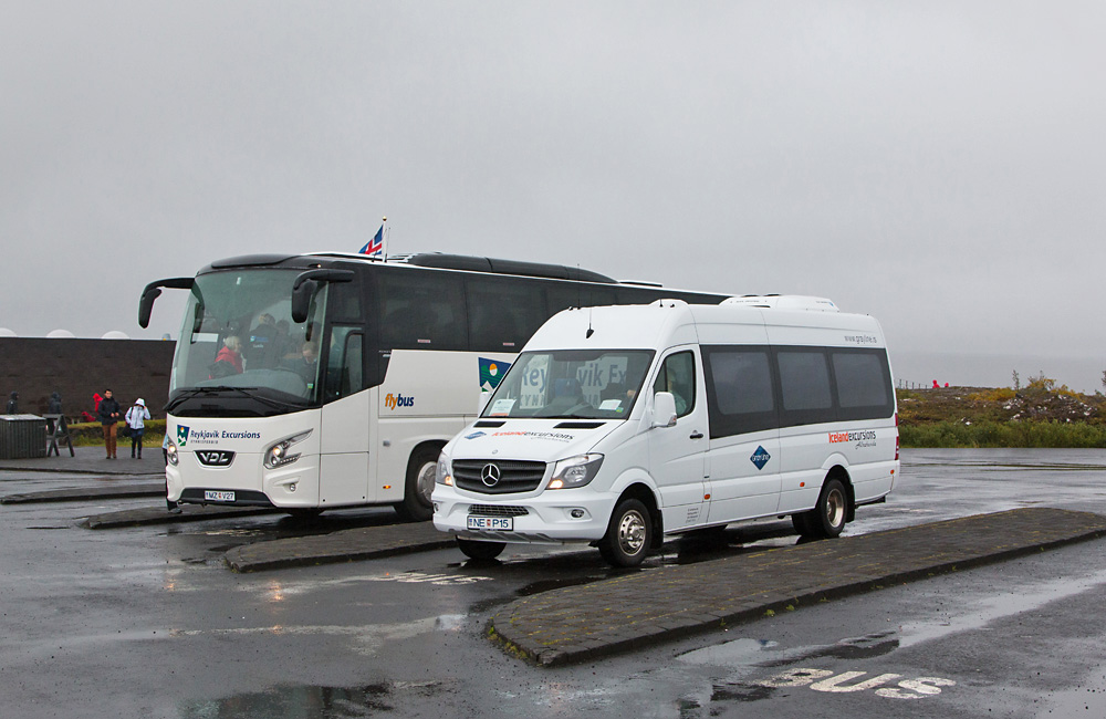 I september åkte vi till Island, Grönland och Alaska. Här är två bussar vid en sevärdhet på Island.