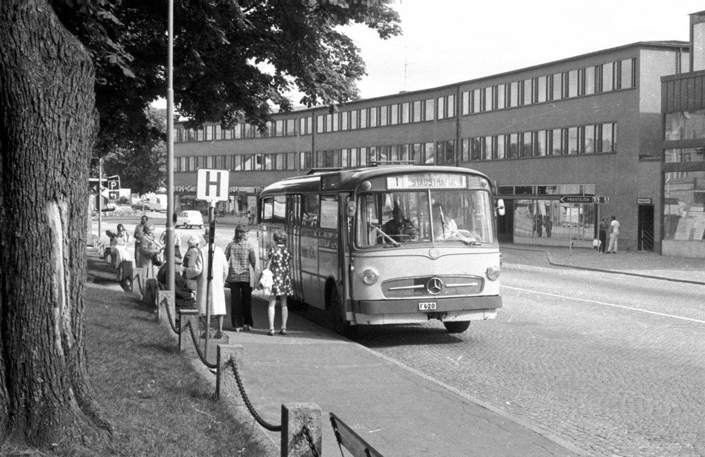 Aha, bussen som Widerqvist sedan köpte. Då kan jag inte låta bli att visa bider på bussen i Värnamo. Bilden från garageplan är från den 12 mars 1972 medan bilden från Kyrktorget är från sommaren samma år. Widerqvist sade till mig många år senare att han hade varit mycket nöjd med Mercedesbussarna.