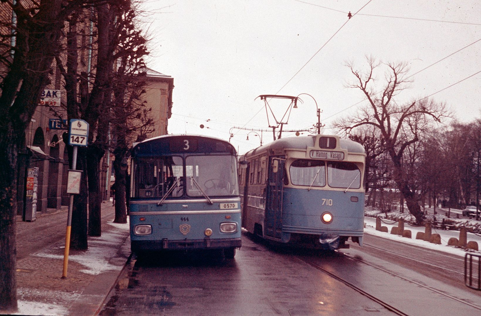 En bild från Stampgatan nära Drottningstorget i Göteborg i november 1968 (tror jag det var). Det har varit någon störning i trafiken vilket syns på att spårvagnen uppenbarligen ska kortvända och att en Scania-Vabis CR 76 med originalyktor har varit ute och ersatt linje 3.
