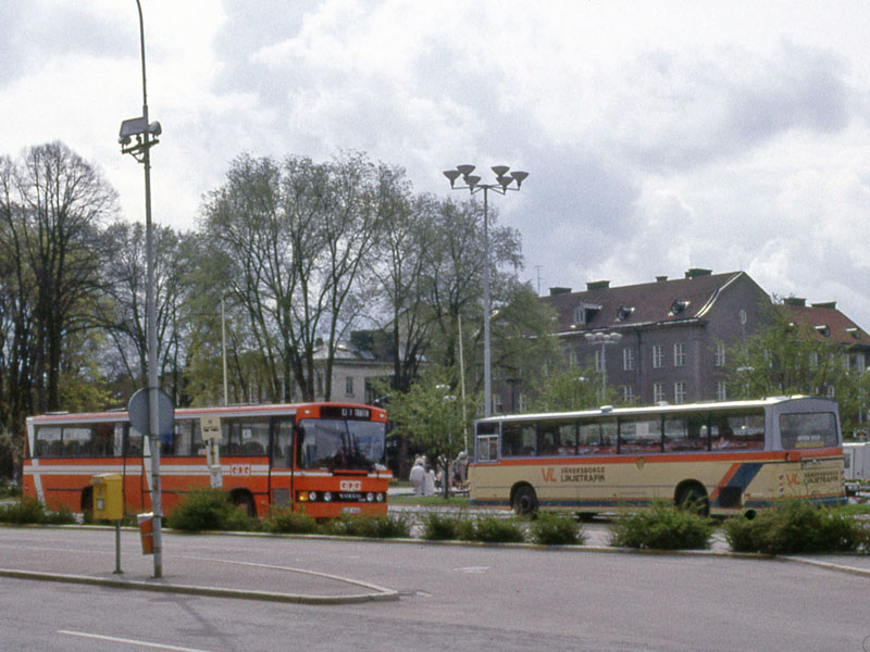 Torget i Vänersborg i maj 1983. Det var två linjer som hade ändstation där, Vänersborgs Linjetrafiks linje Torget-Restad och så linjen Vänersborg-Öxnered. Den senare kördes som jag minns av SJ:s Uddevallalinjer med en buss i halvtimmestrafik. Det var väl inte så praktiskt att ha en sådan isolerad linje tre mil från huvudorten, så kanske hade GDG övertagit linjen 1983, fast jag inte minns det. Annars vet jag inte vad GDG-bussen gör där. Övriga linjer hade ändstation vid järnvägsstationen.