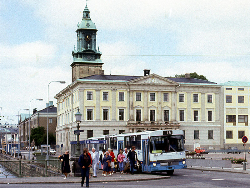 Sommaren 1984 var spårvagnslinjerna 2 och 5 avstängda på Hisingen. På den tiden hade alla spårvagnslinjer ensiffriga linjenummer och lägsta busslinjenummer var 20. Numren på 10-talet var alltså lediga och användes för ersättningsbussar vid större avstängningar när man gjorde särskilda tidtabeller för bussarna. Här ser vi en buss på linje 15 vid Gustav Adolfs torg: