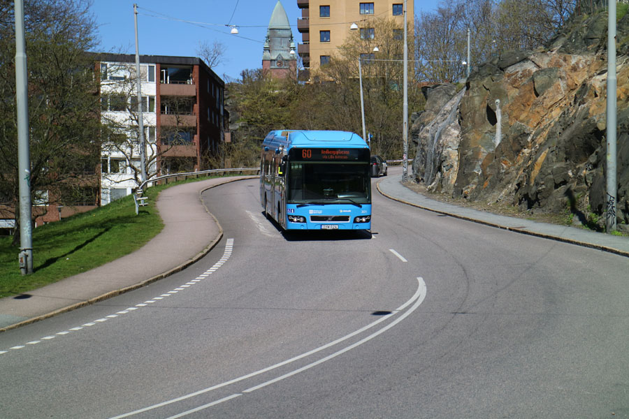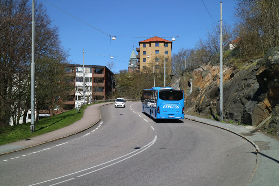 I dag på eftermiddagen var busstrafiken i Linnégatan avstängd till förmån för tåg. Linje 60 fick ta bakvägen upp till Masthugget, d.v.s. via Oskarsleden-Djurgårdsgatan-Fjällgatan. Blå och Rosa express gick mellan Linnéplatsen och Stenpiren via Vegagatan-Fjällgatan-Djurgårdsgatan-Oskarsleden. Därmed blev det tät trafik i Kleva (Fjällgatans backe mot Bangatan). Den trafikerades en gång av trådbusslinjen 36, men numera är det bara några turer på industrilinjen 190 som går där.