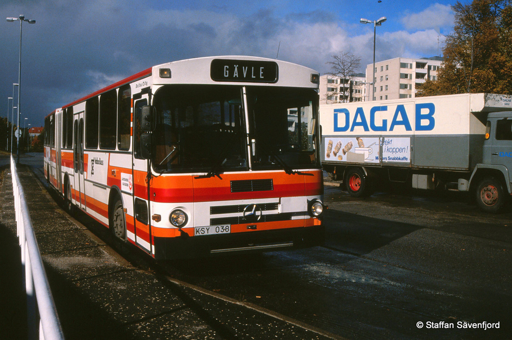 Valbo Omnibus AB 18 KSY038 Mercedes-Benz O305G Deltaplan. Busstationen, Gävle 1986-09-26.