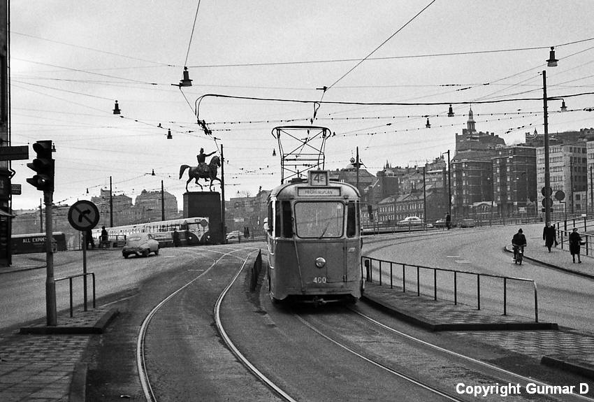 Som sommarextra konduktör hade fotografen förmånen att få tjänstgöra på denna vagn en eftermiddag/kväll nära slutet för sista resterna av vårt fina spårvägstrafiknät, strax innan högertrafiken "slog till". Hade väl tagit ganska många bilder allaredan med min gammalmodiga kamera, men den här vinkeln återstod.