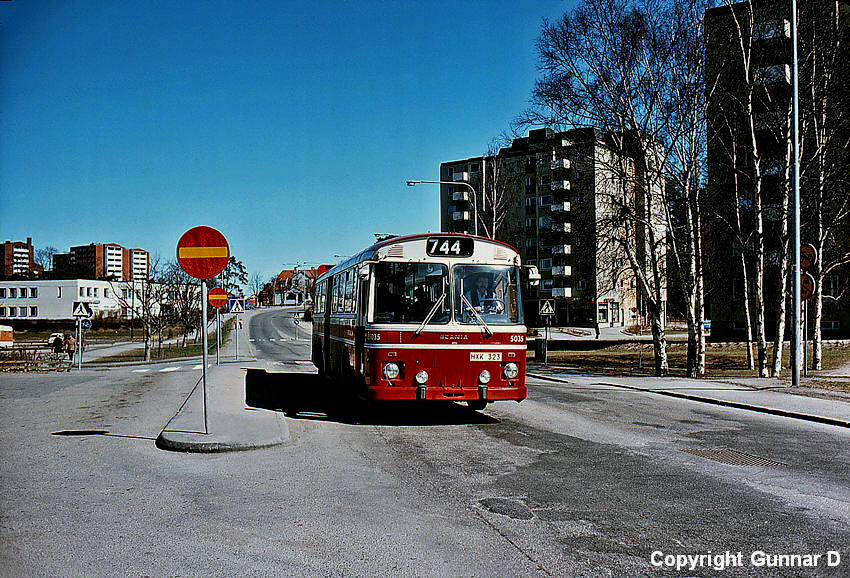 En nästan ny H56 5035 på Kommunalvägen närmar sig Huddinge Centrum i apr 1976.